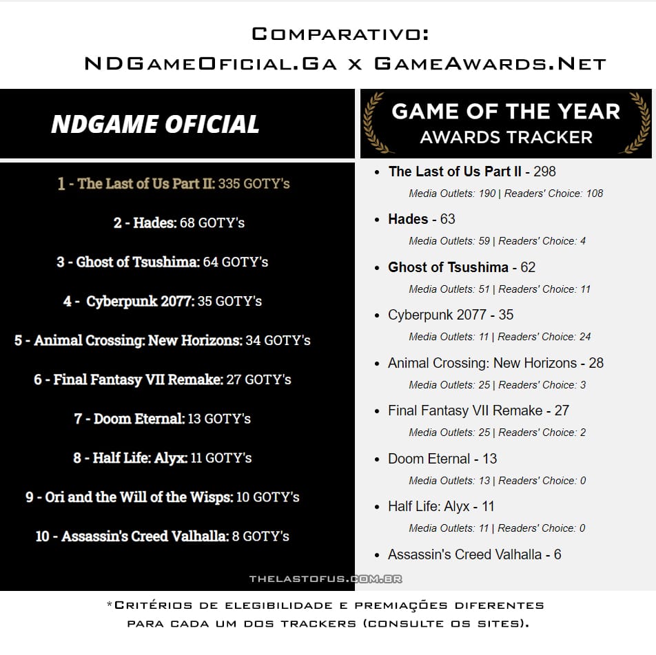 É importante ressaltar que há critérios de elegibilidade diferentes para cada um dos trackers (consulte os sites). No caso do NDGameOficial.Ga, você pode conferir a lista completa dos veículos elegíveis que escolheram The Last of Us 2 como G.O.T.Y clicando aqui.